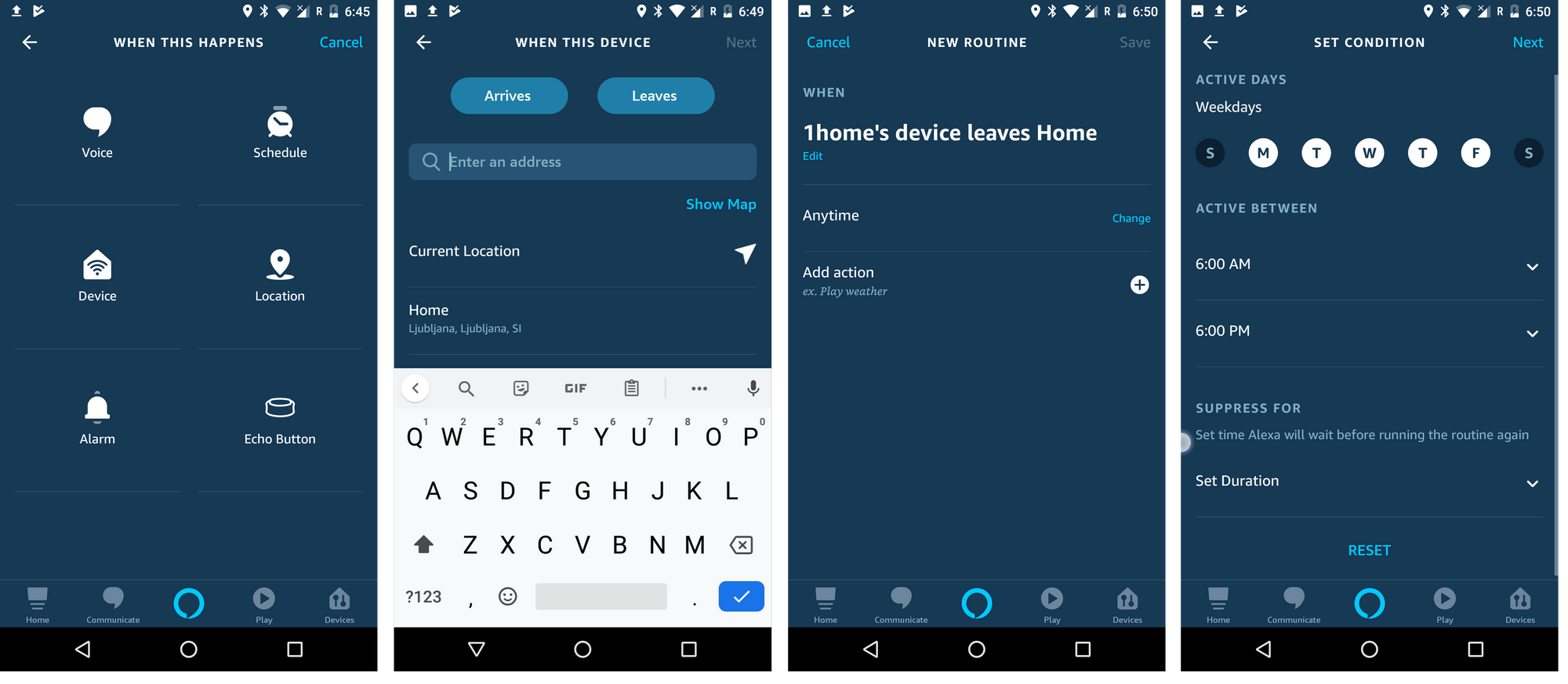 Um die Funktion “Geolocation” von Alexa zu nutzen, klicken Sie auf „Location“ und legen Sie fest, wo eine Automatisierung ausgelöst werden soll. Nachdem Sie ein sogenanntes Geofence eingerichtet haben, werden die Geräte standortbasiert ausgelöst, sobald Sie dieses Geofence betreten oder verlassen. Sie können Ihre Adresse (privat oder geschäftlich) angeben oder eine bestimmte Adresse definieren. Die genaue Größe des Geofence kann nach Ihren Wünschen modifiziert werden.