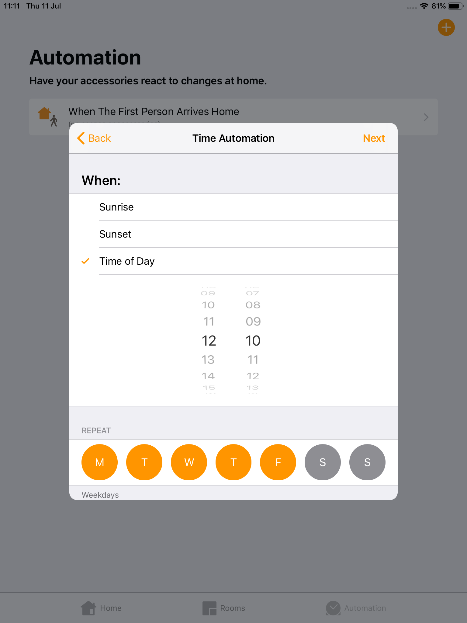Um eine Automatisierung zeitbasiert auszulösen, klicken Sie auf „Schedule“ und wählen die gewünschte Uhrzeit aus. Sie können auch einen flexiblen Zeitpunkt, wie Sonnenaufgang oder Sonnenuntergang, wählen (besonders hilfreich bei Lichtautomatisierungen):