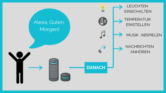 Wenn Sie z.B. “Alexa, Zeit zum Abendessen” sagen, wird Alexa bekannt geben, dass das Abendessen fertig ist, das Licht im Wohnzimmer einschalten und auf TuneIn entspannende Musik spielen.
