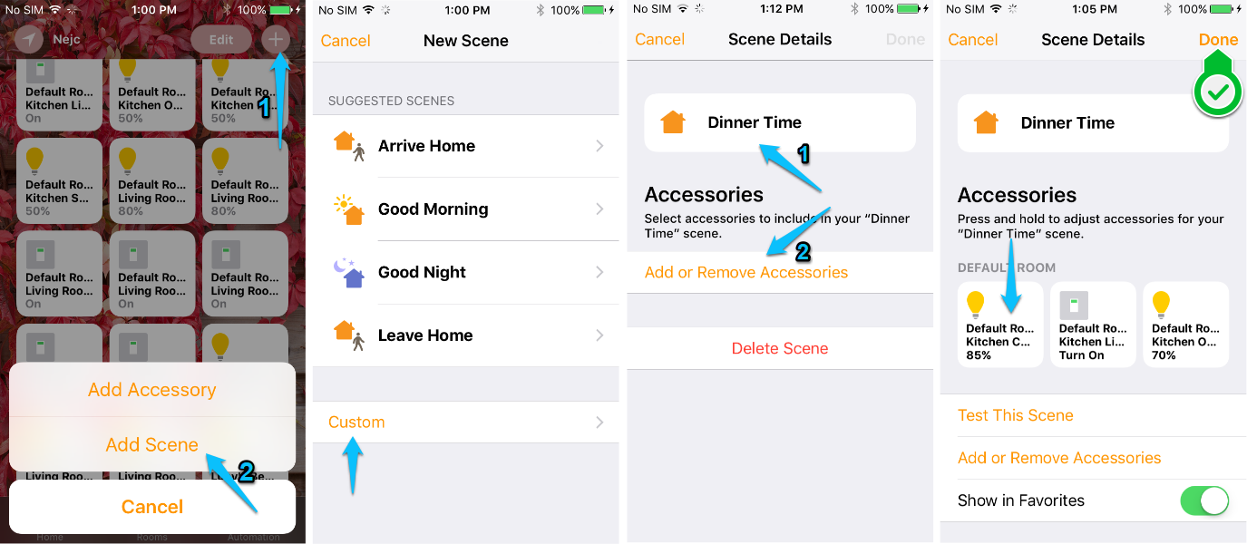 - Wählen Sie den Namen, den Sie verwenden möchten (z.B. “Zeit zum Abendessen”). Tippen Sie auf “Zubehör hinzufügen oder entfernen”, um neue Smart Home-Geräte hinzuzufügen.