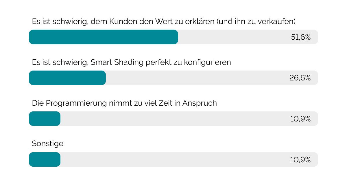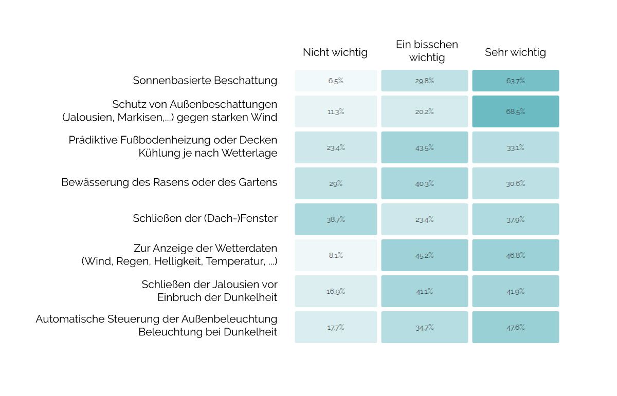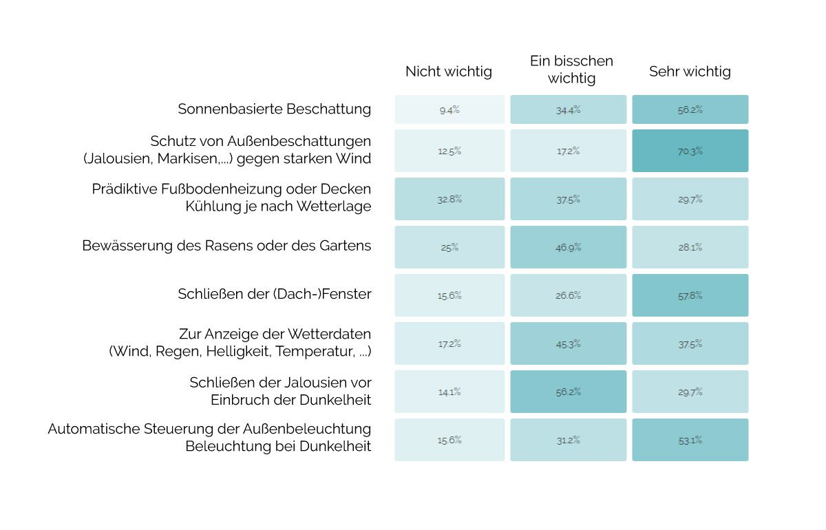 Auf die Frage, welche Funktionen der Wetterstation für sie am wichtigsten sind, steht der Schutz vor Wind bei weitem an erster Stelle. Aber auch das Schließen der Dachfenster bei Regen und die Steuerung der Außenbeleuchtung stehen in diesem Fall ganz oben auf der Wichtigkeitsliste - direkt neben dem intelligenten Beschattungsalgorithmus (Abbildung 13).