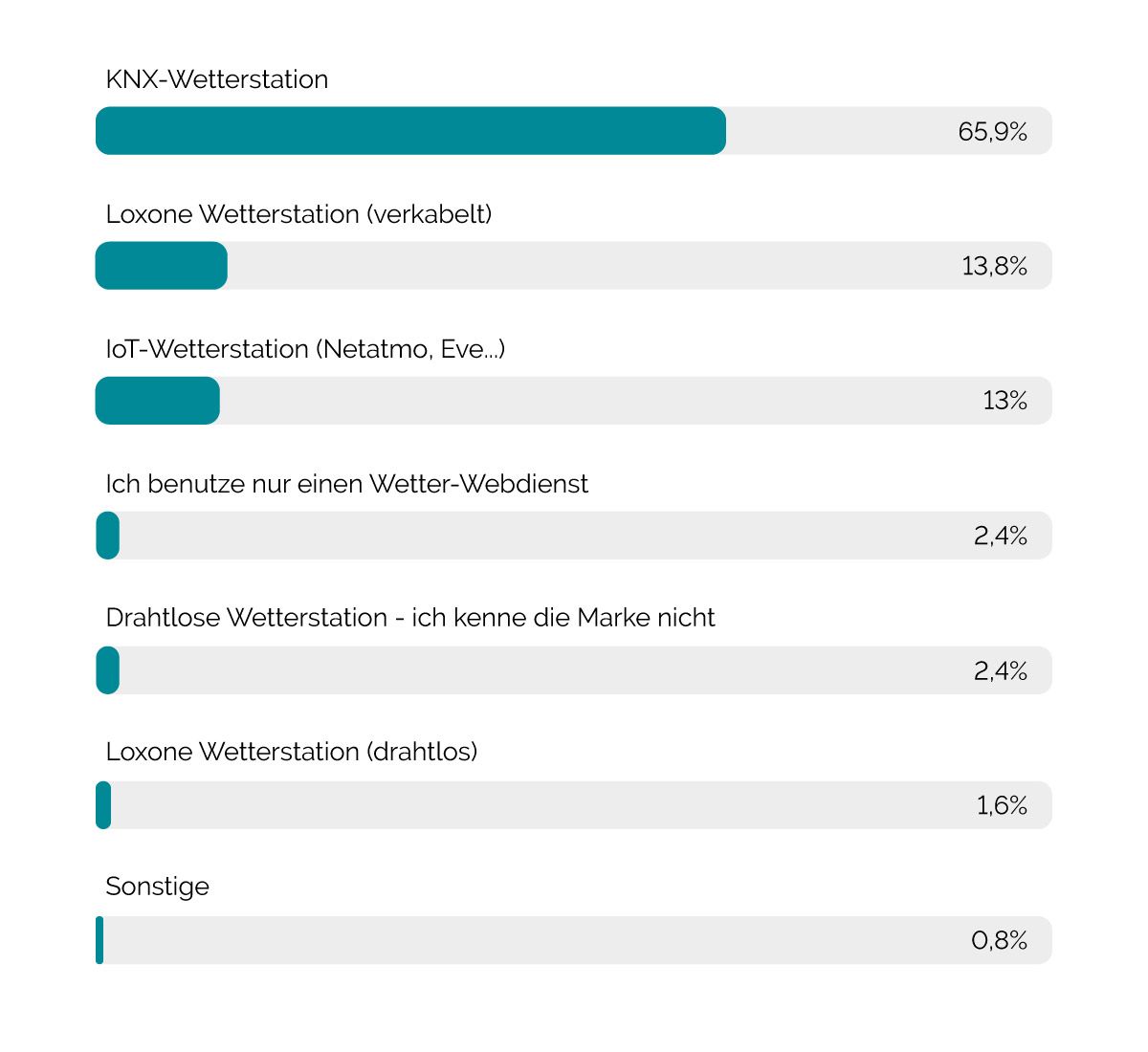 Daraus können wir ersehen, dass bei KNX 81 von 149 Nutzern (54 %) eine KNX-Wetterstation haben und bei Loxone 17 von 59 Nutzern (28 %) eine Loxone-Wetterstation.