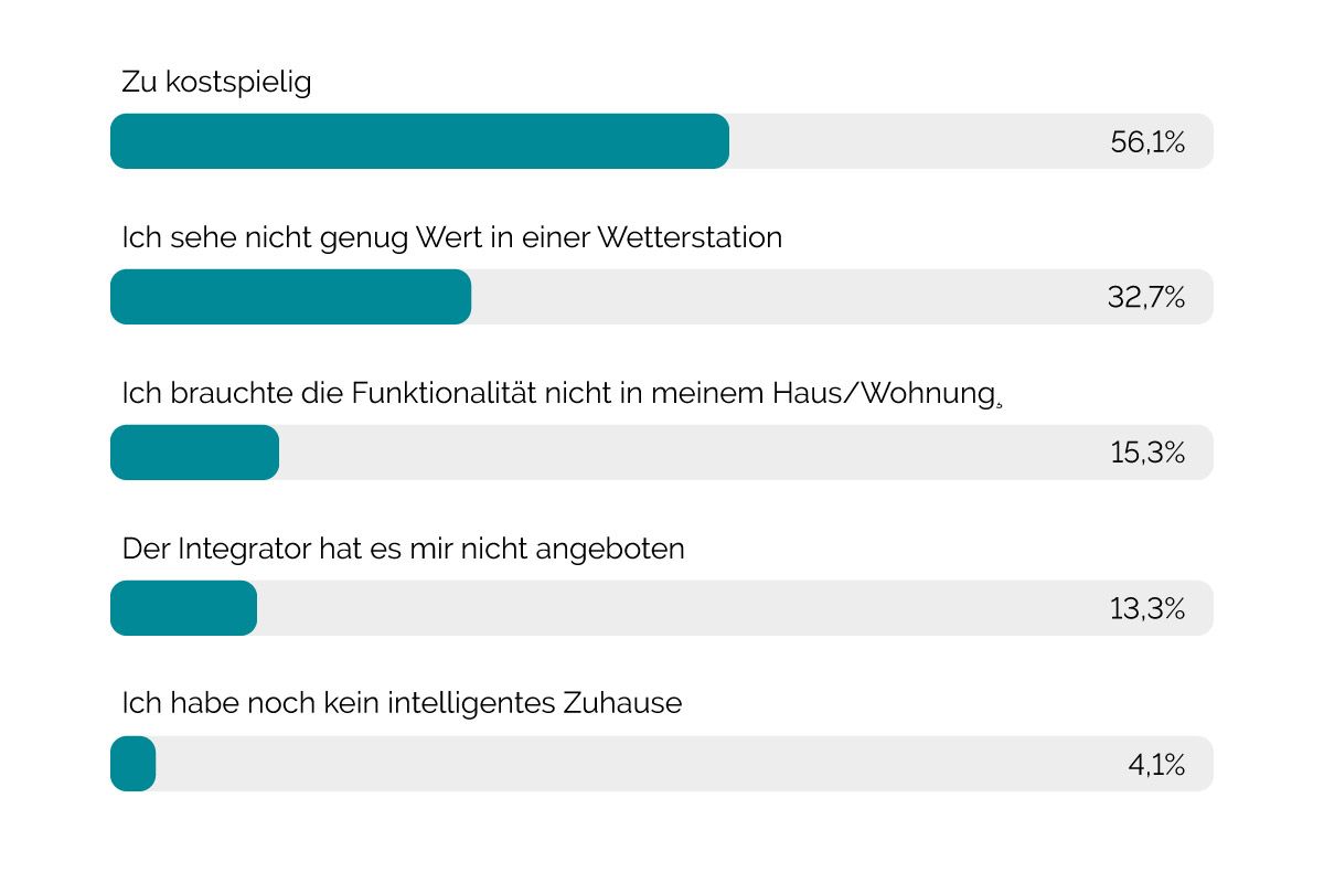 Aber warum haben diese Nutzer die Wetterstation dann nicht gleich installiert? In einigen Fällen wurden sie nicht darüber informiert, einige Nutzer sehen den Wert eines solchen Geräts nicht, aber meistens ist das Hindernis einfach budgetbedingt - Wetterstationen werden von mehr als der Hälfte der Endnutzer, die sie schließlich nicht installiert haben, als zu teuer angesehen (Abbildung 6).