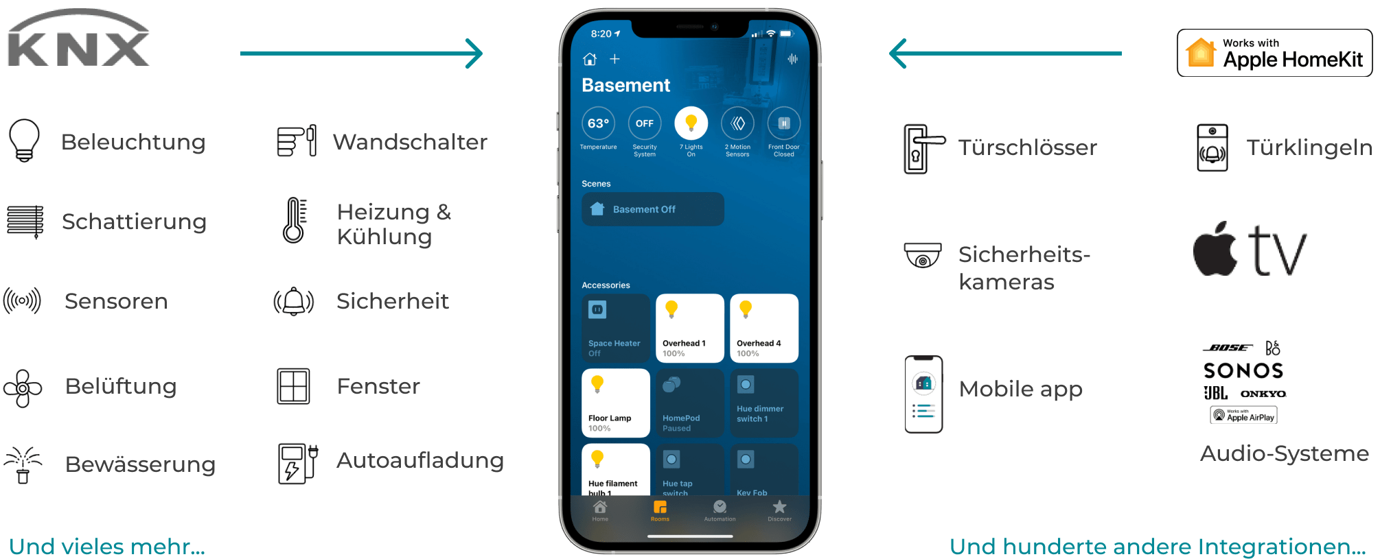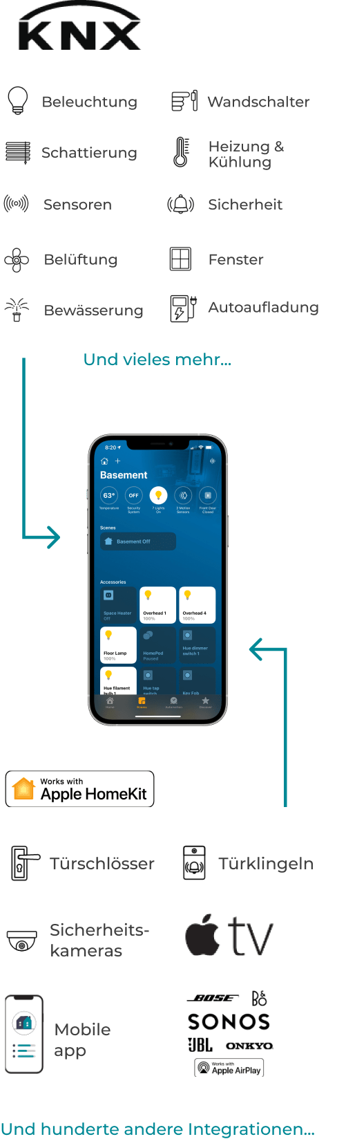 Während KNX das Grundgerüst ist, wird Apple HomeKit Ihre Steuerzentrale sein. Es bietet die ausgefeilteste und benutzerfreundlichste Smart Home App auf dem Markt und gibt Ihnen gleichzeitig die vollständige Kontrolle darüber. Indem Sie das gesamte KNX System mit HomeKit steuerbar machen und auch andere smarte Gadgets unter das HomeKit Dach bringen, erschaffen Sie ein Apple Erlebnis in Ihrem Smart Home. Was kann das noch übertreffen?