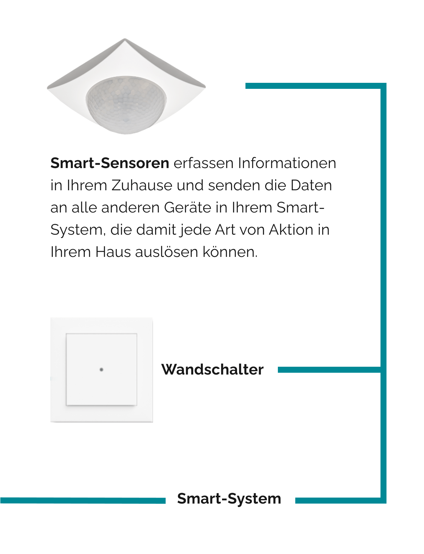Während Aktoren Ihre elektrischen Geräte tatsächlich dazu bringen, etwas zu tun, sind Sensoren dazu da, Informationen aus der realen Welt zu sammeln und sie an Ihr intelligentes System zu senden, damit andere Geräte wie Aktoren sie nutzen können, um ihre Befehle auszuführen (z. B. die Jalousien zu öffnen). Der gebräuchlichste Sensor ist ein Wandschalter, mit dem Sie normalerweise ein Licht einschalten. Ein Wandschalter erkennt einfach einen Tastendruck und sendet ihn an das System, so wie der Bewegungssensor die Information sendet, dass er eine Bewegung erkannt hat. Auf diese Weise kann ein einziger Wandschalter mit einem einzigen Tastendruck mehrere Leuchten oder Jalousien steuern. Neben Wandschaltern und Bewegungsmeldern gibt es viele verschiedene Sensoren wie Helligkeits-, Temperatur-, Feuchtigkeits-, CO2-, Leckage-, Wind-, Regensensor und viele mehr.