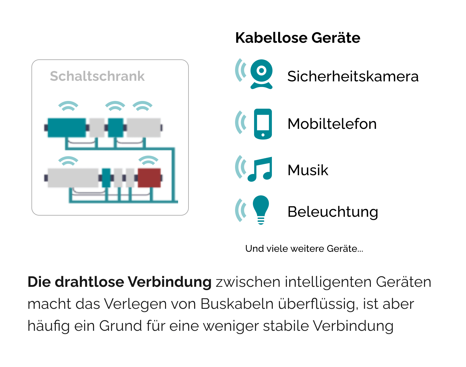 Um das Beste aus beiden Welten herauszuholen, können Sie sowohl kabellose als auch kabelgebundene Geräte mit einem Gateway verbinden. Das Gateway dient als Zwischengerät, das sowohl mit dem Buskabel als auch mit dem drahtlosen Netzwerk und allen kabellosen Geräten verbunden ist und es ihnen ermöglicht, nahtlos miteinander zu kommunizieren.