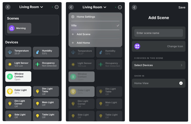 Another way to create scenes is with a “what you see is what you get” approach. When you are selecting devices to be included in a scene, they are automatically set to their current values. This means that you can also set the desired ambient in the room, then add a scene - thus “saving” your current desert ambient in the room without any further configuration required.