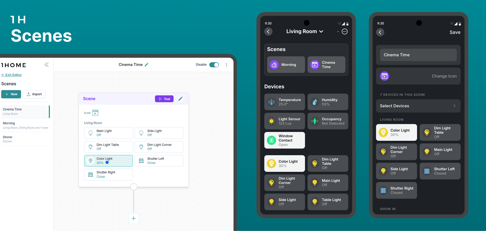 - By the integrator directly in the 1Home web dashboard - advanced Scenes that can also leverage 1Home Automations