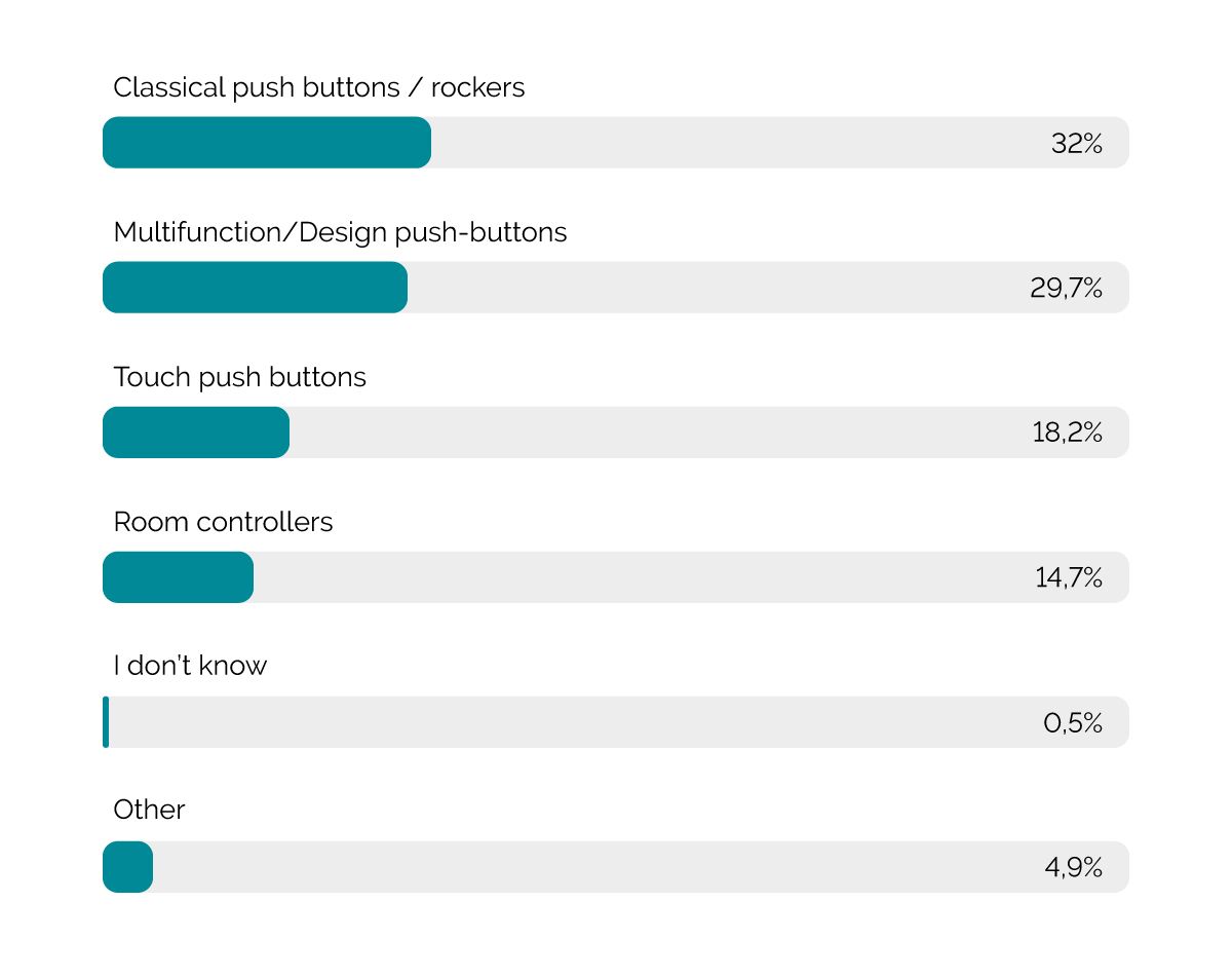 Our first question was related to what type of manual controls our participants have built into their homes (Figure 3). We were surprised to learn that multifunction/design push-buttons (such as Basalte Sentido for example) are almost as popular as push buttons and rocker switches with a more classical look (like Gira KNX Basic for example).