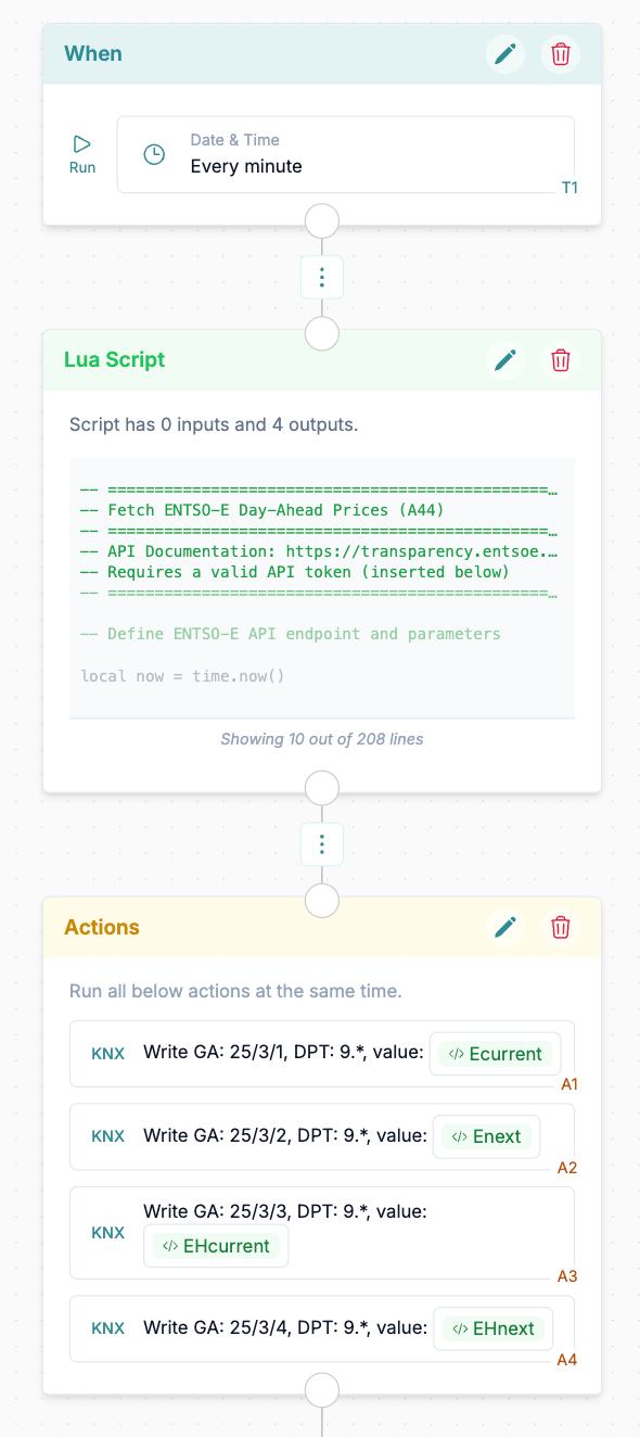 What was left was the classical procedure of writing the newly acquired values to KNX group addresses then creating virtual Generic devices for each of these values (current_price_wholesale, next_price_wholesale, current_price_household, next_price_household), which I did with a an action block in the 1Home automations.