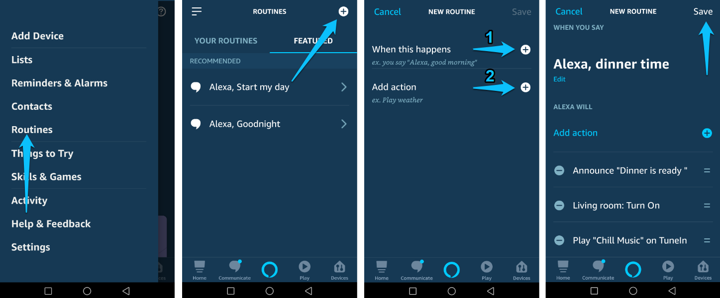 Wenn Sie z.B. “Alexa, Zeit zum Abendessen” sagen, wird Alexa bekannt geben, dass das Abendessen fertig ist, das Licht im Wohnzimmer einschalten und auf TuneIn entspannende Musik spielen.
