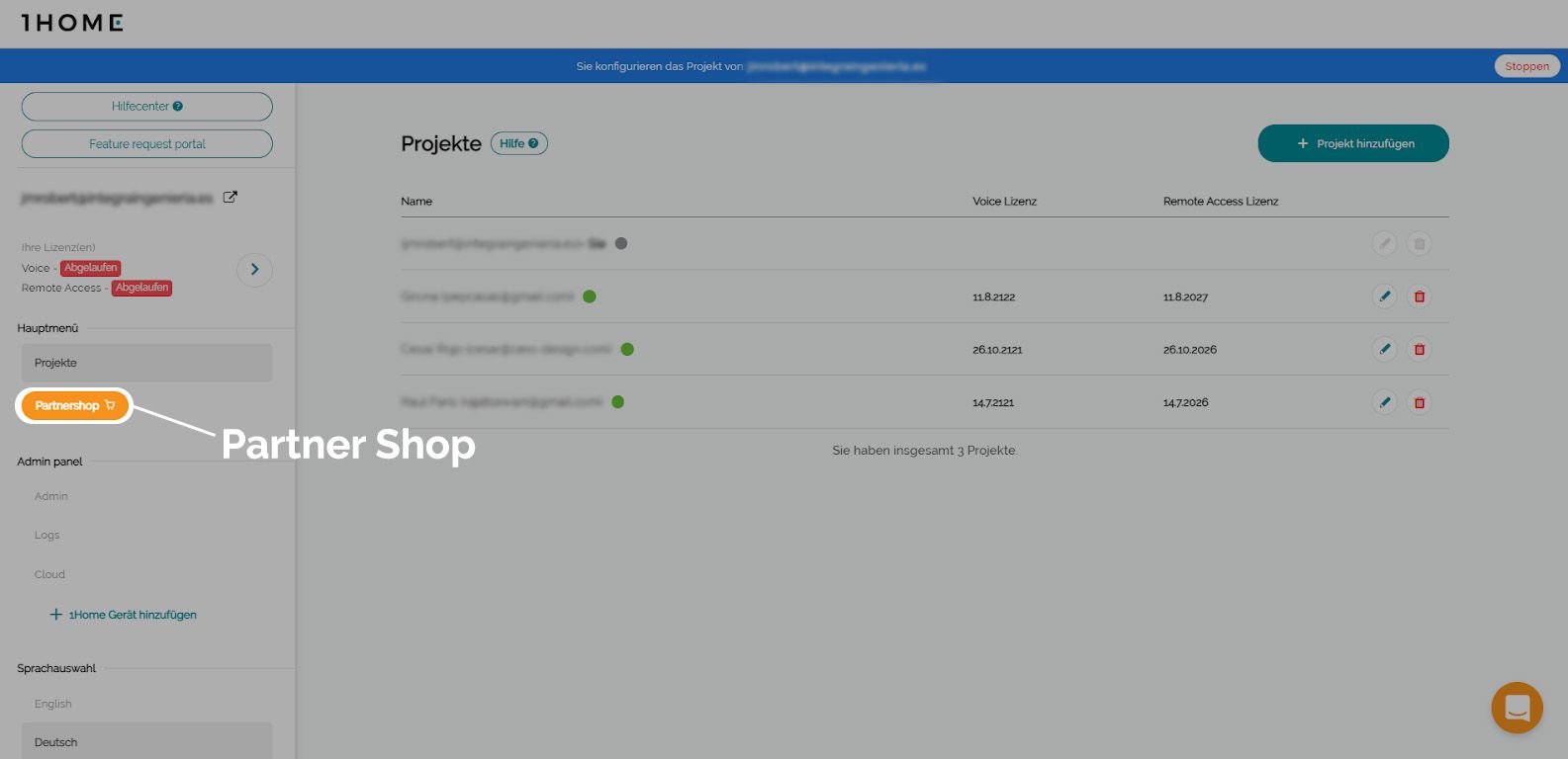 - Melden Sie sich beim 1Home Profil des Kunden an (oder öffnen Sie es einfach über die Registerkarte "Projekte" in Ihrem 1Home Dashboard)