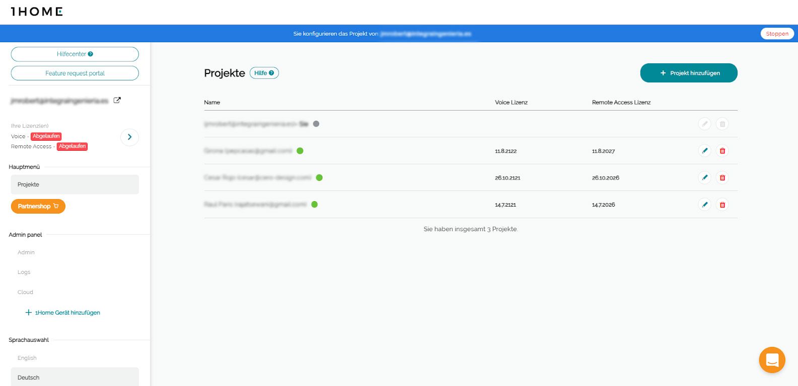 Des Weiteren haben wir auf der Registerkarte “Projekte” Statusanzeigen eingeführt. In Ihrem Integrator Dashboard finden Sie alle Projekte Ihrer Kunden auf der Registerkarte "Projekte". Jetzt befindet sich neben jedem Projekt ein Indikator, der anzeigt, ob das Projekt online (grüne Farbe) oder offline (rote Farbe) ist.