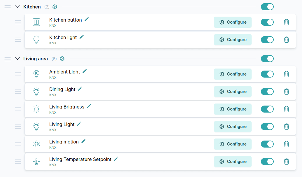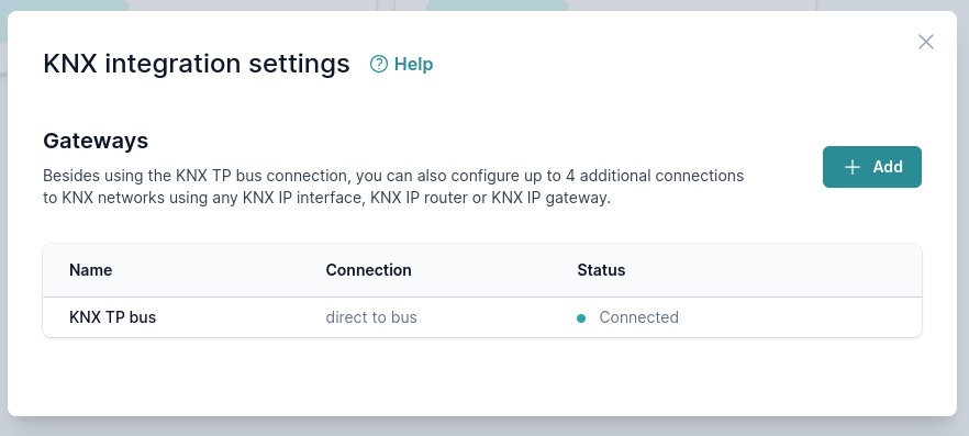 Sie können auch jederzeit bis zu 4 zusätzliche Verbindungen zu KNX über KNX IP-Schnittstellen hinzufügen. Erfahren Sie mehr in der Anleitung Verbindung mit KNX.