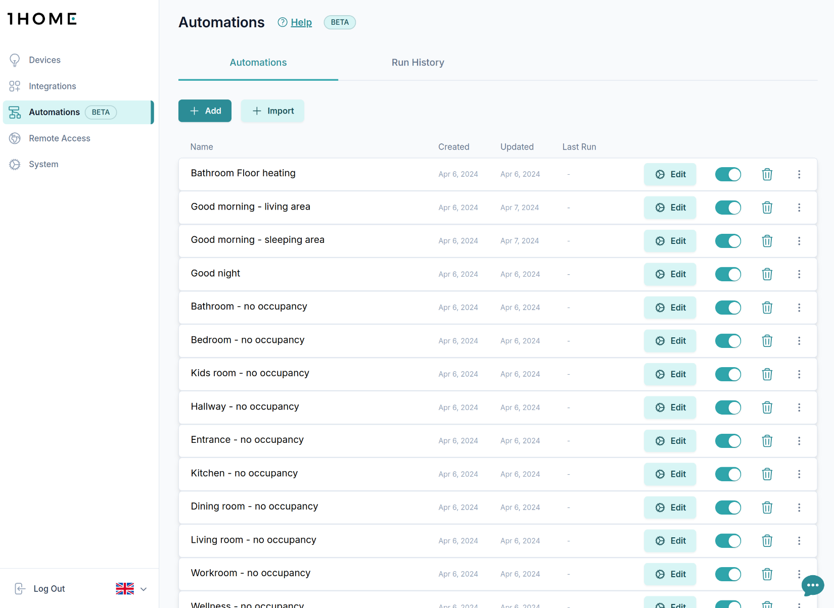To access your automations, navigate in the left side bar of your 1Home Server dashboard to Automations tab. Here you will see a list of all of your automations.
