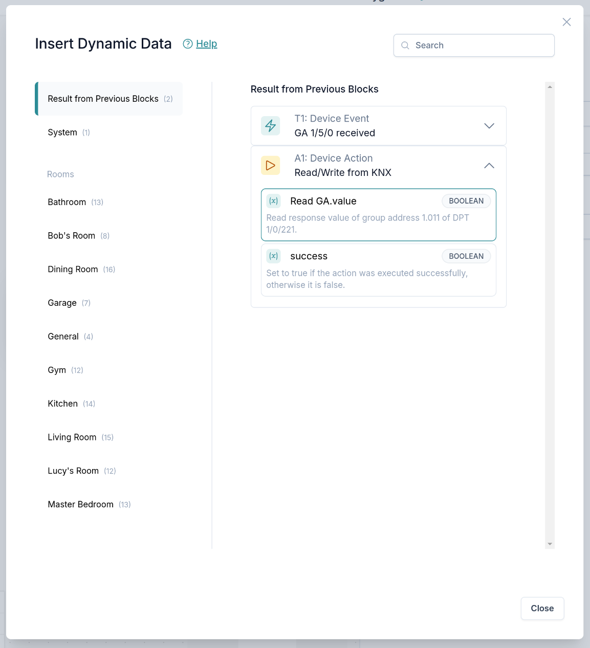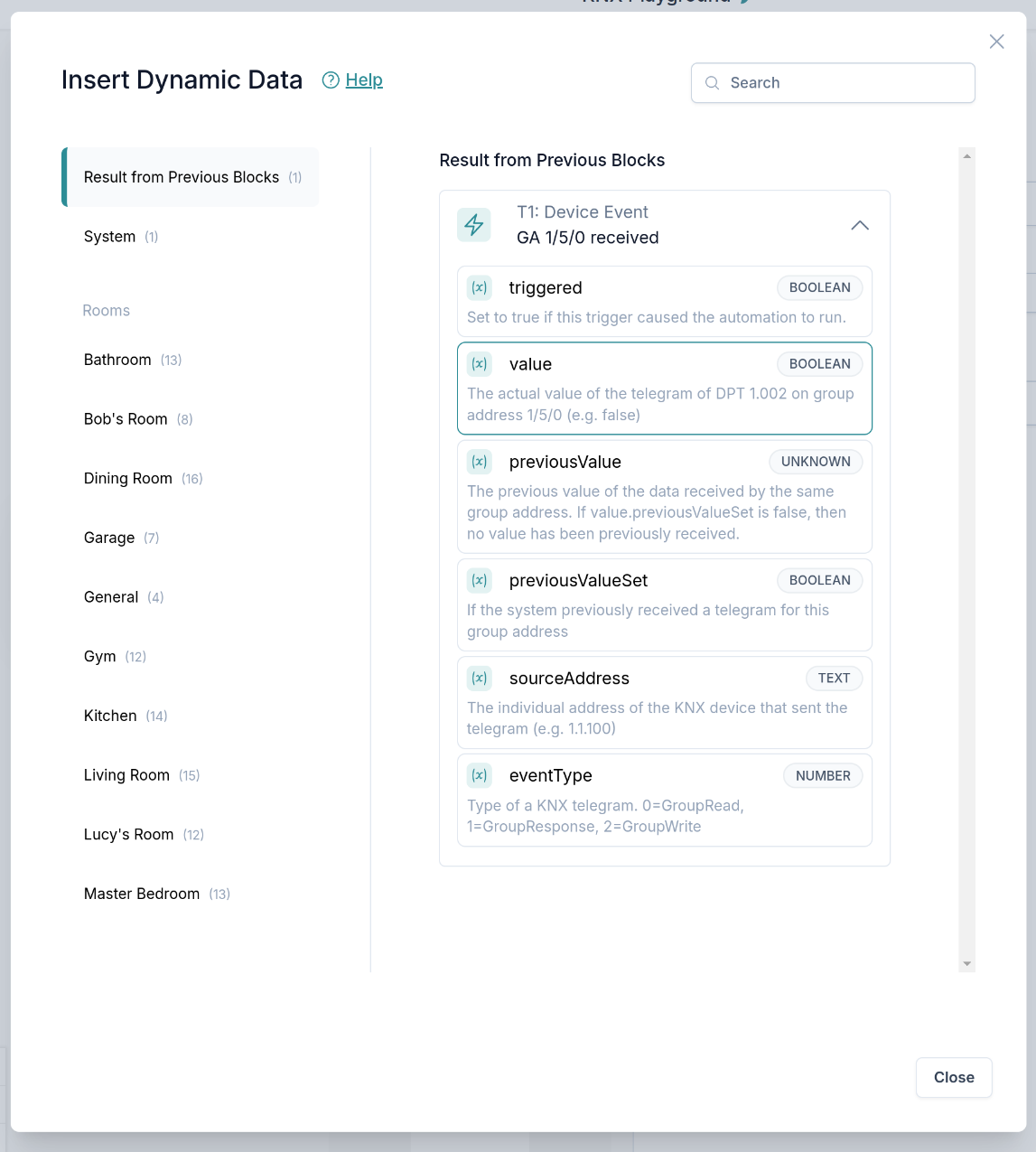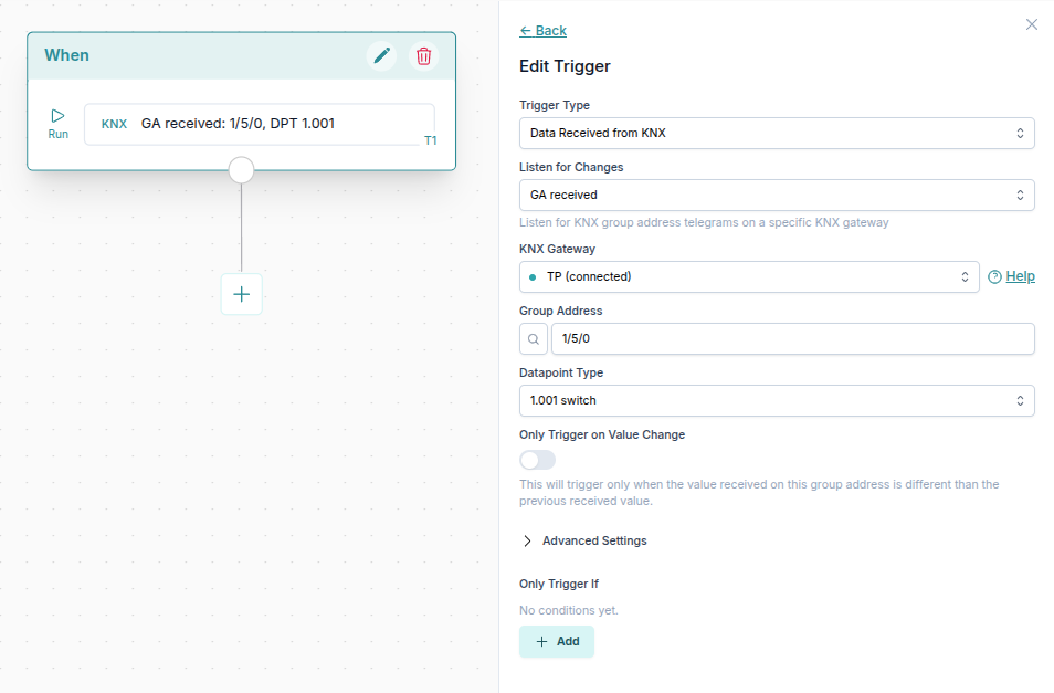 Group Address- If you have previously imported an ETS project file, you can select a group address from the list and search for it by name. If the Datapoint Type was provided in ETS it is automatically selected. Otherwise you can manually type in the group address.Datapoint Type- You can choose from many different KNX Datapoint Types to specify in which way you expect the telegram to be interpreted, full list here.Only Trigger on Value Change- For some telegrams such as push button events you want to react every time, even if the value that you receive is the same as the previous one. With other devices where you only want to react on state change (e.g. water pump), you canenablethis value and any retransmits of the same value will be ignored.