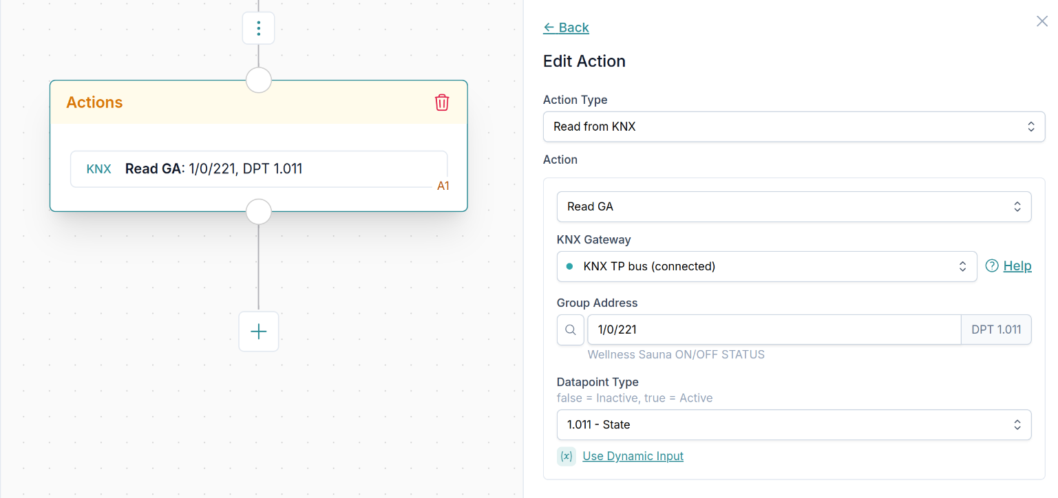 You can read a value from a KNX bus for a specific group address, datapoint type and gateway. You can then use the received value in the next steps of the automation.