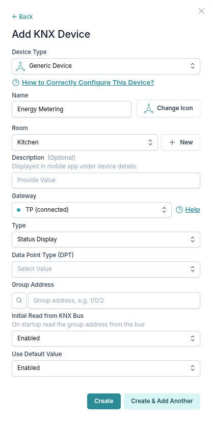 Provide details such as name, KNX gateway, room, and optional description. Also select Type as Status Display.