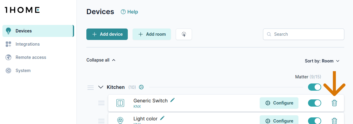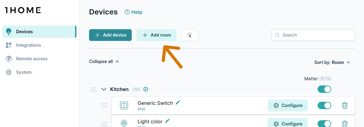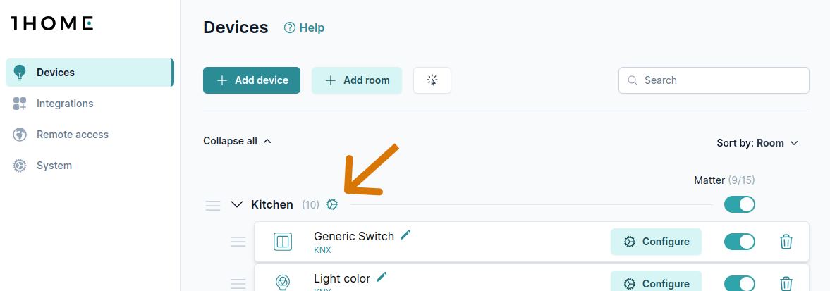Utilice el botón Buscar o Colapsar todo para localizar más rápidamente cualquier dispositivo o habitación.