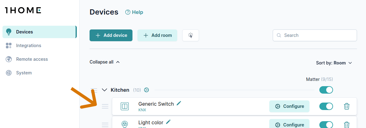 Utilice la función arrastrar y soltar al lado de cada habitación y dispositivo para reorganizar los dispositivos en las habitaciones o moverlos entre habitaciones.
