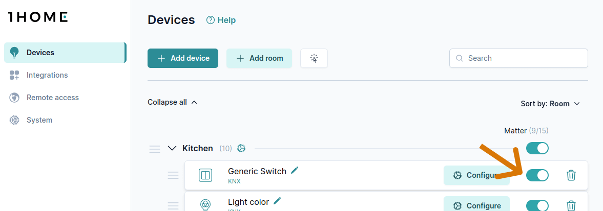 Con grandes instalaciones KNX, una vez habilitados/deshabilitados los dispositivos, dé a su app móvil Matter un par de minutos para sincronizar todo. Durante este tiempo la aplicación Matter puede mostrar "Actualizando" o un estado similar.