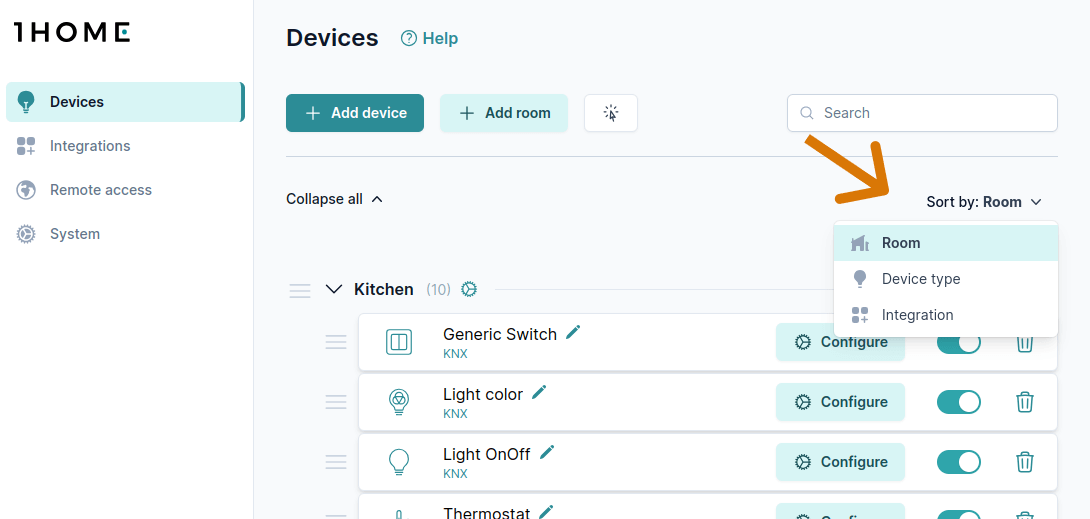 Para facilitar la visión general, tiene múltiples opciones para ver sus dispositivos. Puede ver por habitaciones, tipos de dispositivos o integraciones.