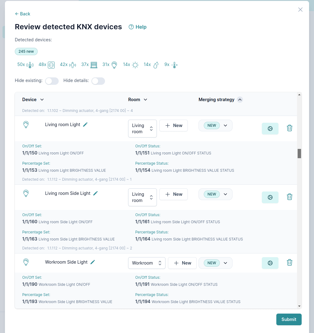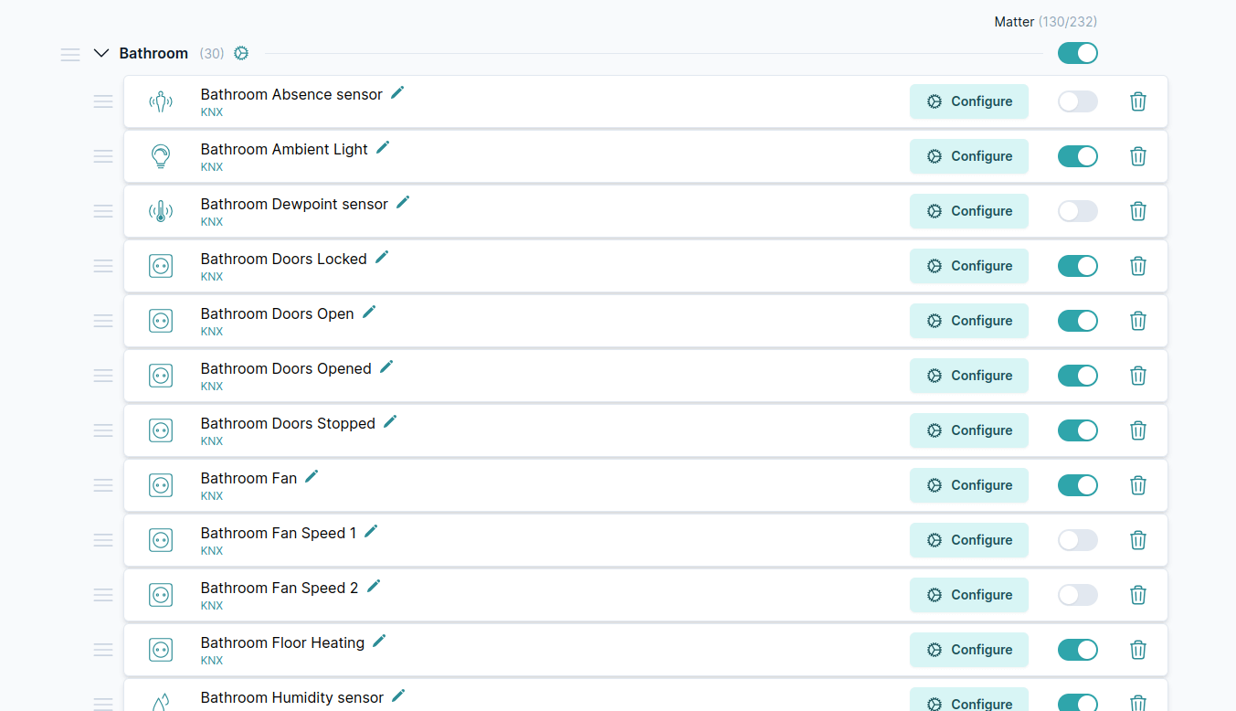 ¡Esta es una enorme instalación KNX en la imagen de arriba! Imagínese tecleando direcciones de grupo para configurar alrededor de 150 dispositivos que fueron seleccionados para ser controlados con Apple Home a través de Matter. Afortunadamente, el propietario de esta casa inteligente pudo evitarlo utilizando nuestra detección automática ETS. 😄