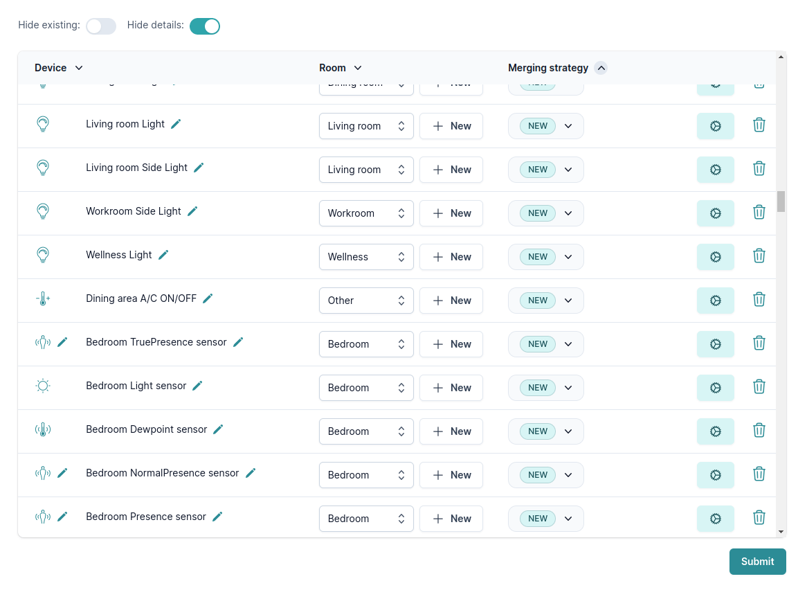 En la vista de dispositivos detectados puede crear fácilmente nuevas habitaciones o mover dispositivos entre ellas.