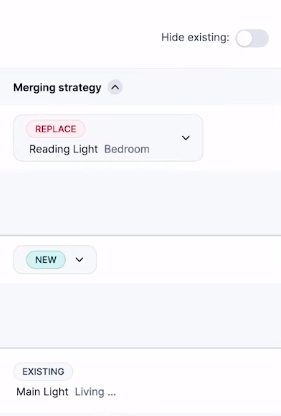 Vea el estado de fusión de cada dispositivo en una de las columnas como se muestra a continuación. Observe también el botón Ocultar existentes para facilitar el trabajo cuando se detectan muchos dispositivos como existentes.