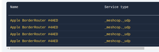 - 1.2. Investigue si el hub en cuestión es descubierto por el 1Home Server dentro de la lista de servicios descubiertos. Los dispositivos que suelen estar relacionados con los asistentes inteligentes aparecen resaltados (véase el ejemplo siguiente para el hub Apple Home). Si no ve su hub en la pantalla de abajo y está experimentando problemas de puenteo de Matter (sin conexión, sin respuesta, etc.) asegúrese de que el hub de Matter y el Server están dentro de la misma LAN así como que mDNS está correctamente configurado (ver abajo para más detalles).