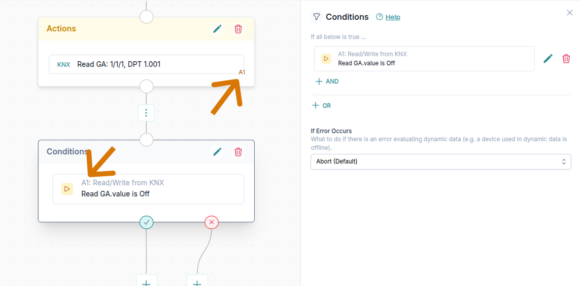 Nell'anteprima dell'automazione puoi vedere rapidamente da quale azione è stato preso il valore controllando il riferimento dell'Azione (ad esempio A1 nell'immagine sotto).