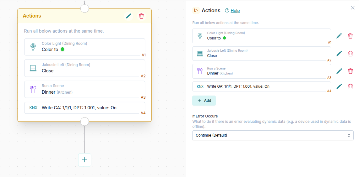 Tutte queste azioni verranno eseguite contemporaneamente in parallelo. Questo è utile se vuoi, ad esempio, accendere più luci contemporaneamente.