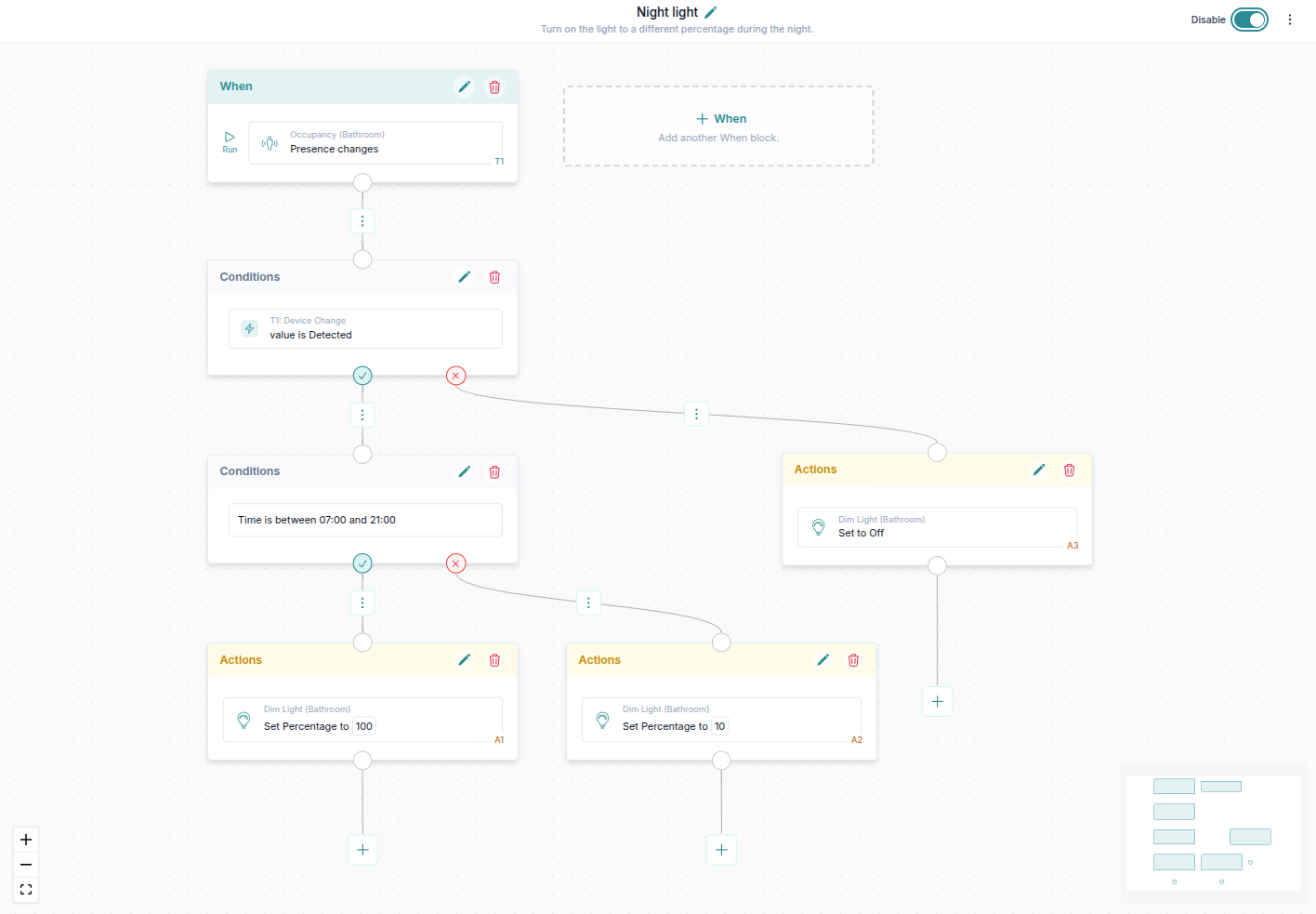 Nell'immagine qui sotto abbiamo creato un'automazione che reagisce ai cambiamenti del sensore di presenza del bagno e accende la luce a una percentuale diversa durante il giorno o la notte. Se il sensore smette di rilevare movimento, la luce si spegne.