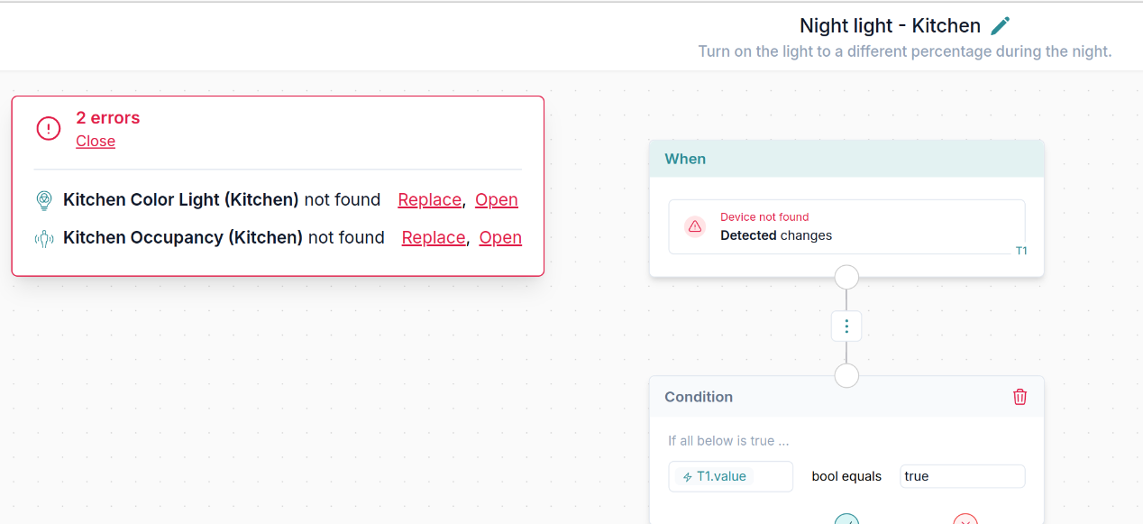 Qui puoi vedere tutti i dispositivi utilizzati in questa automazione. Sostituiamo automaticamente i dispositivi del bagno con quelli della cucina ovunque siano utilizzati in questa automazione.
