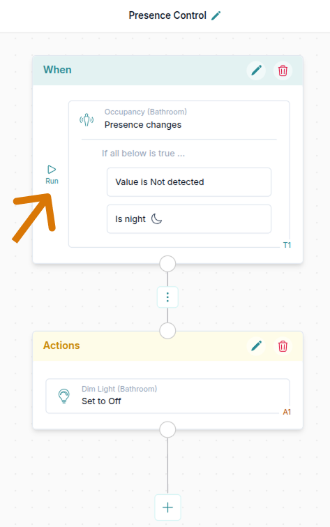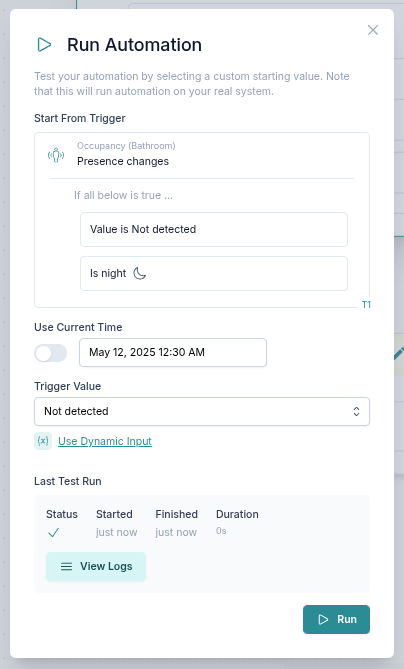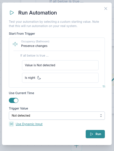 - Ora - seleziona tra ora personalizzata e ora corrente. Questa opzione è utile se l'automazione contiene controlli basati sull'ora o sull'alba/tramonto.