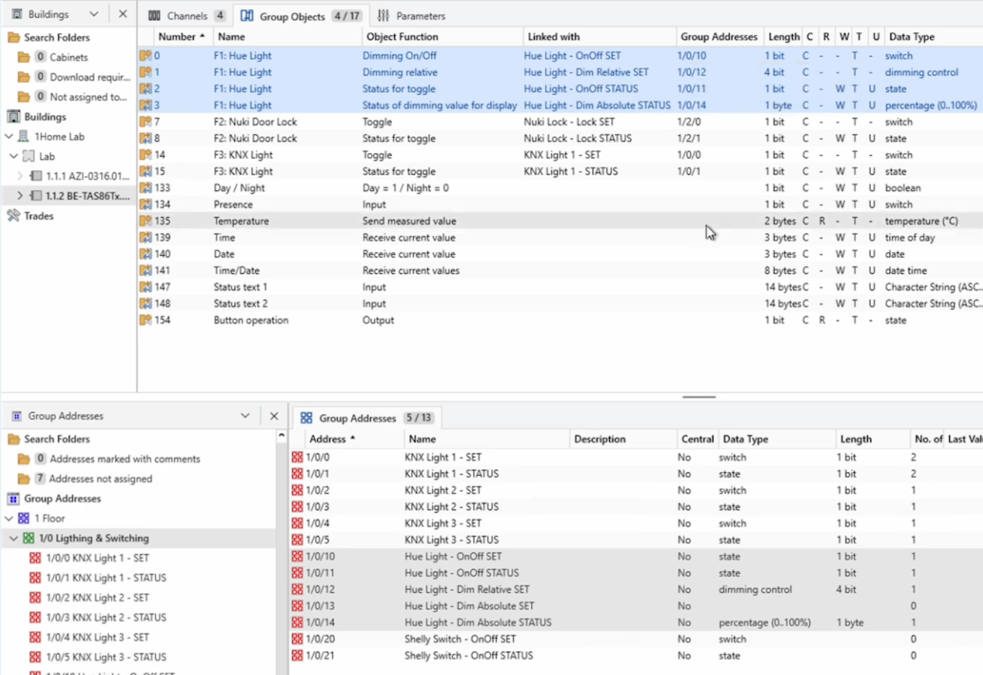 Come si può vedere, sono disponibili tutti i classici oggetti di gruppo KNX da collegare agli indirizzi di gruppo.