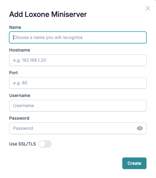 Name- Il nome del gateway che verrà utilizzato all'interno del server 1Home.Hostname- L'IP o il dominio del MiniserverPort- La porta TCP/IP di MiniserverUsername- Nome utente dell'account MiniserverPassword- Password dell'account MiniserverUse SSL/TLS- Abilita TLS per la connessione