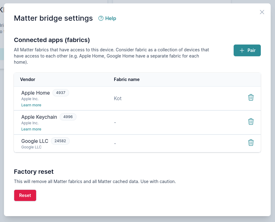 Se si seleziona quest'ultima opzione, la connessione a tutte le app Matter andrà persa e dovrà essere riconfigurata.