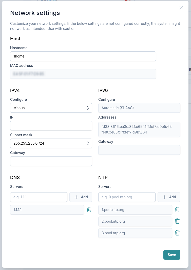1home, sarà possibile accedere alla dashboard locale sotto1home.local(o1home-2.local,1home-3.localecc. se più server 1Home con lo stesso hostname si trovano sulla stessa rete). - IPv4 - Scegliere tra la configurazione IPv4 automatica (DHCP) o manuale.