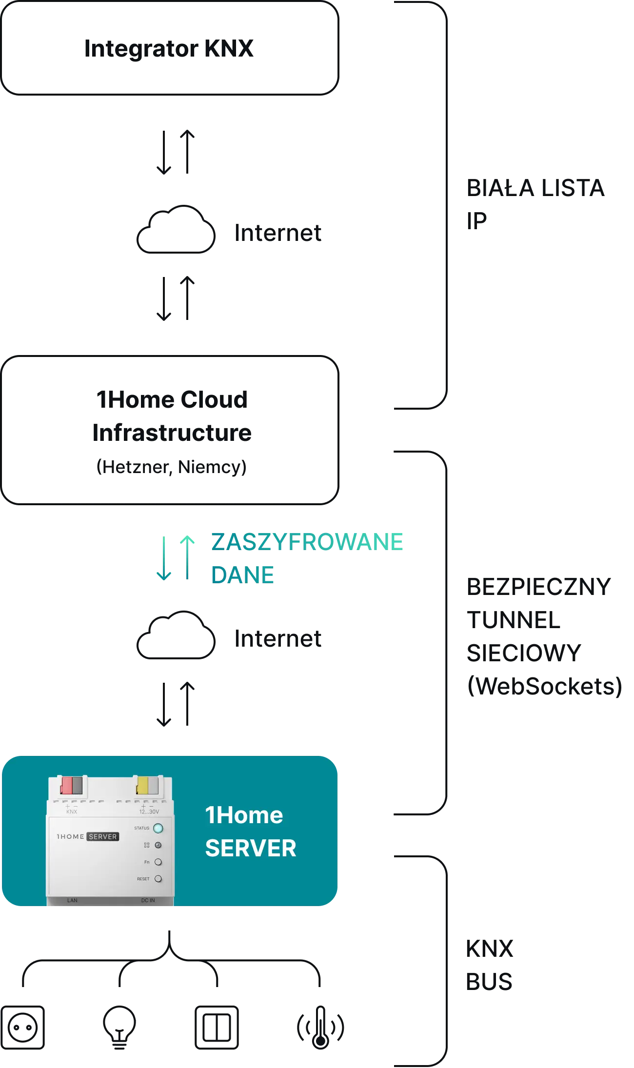 1Home Server działa lokalnie i jeśli odłączysz go od Internetu, nawet nie zauważysz różnicy. Zarówno KNX, jak i Matter nie wymagają połączenia z Internetem, więc Twój dom zawsze będzie działał bez zakłóceń (z wyjątkiem sterowania głosowego, które wymaga Internetu).