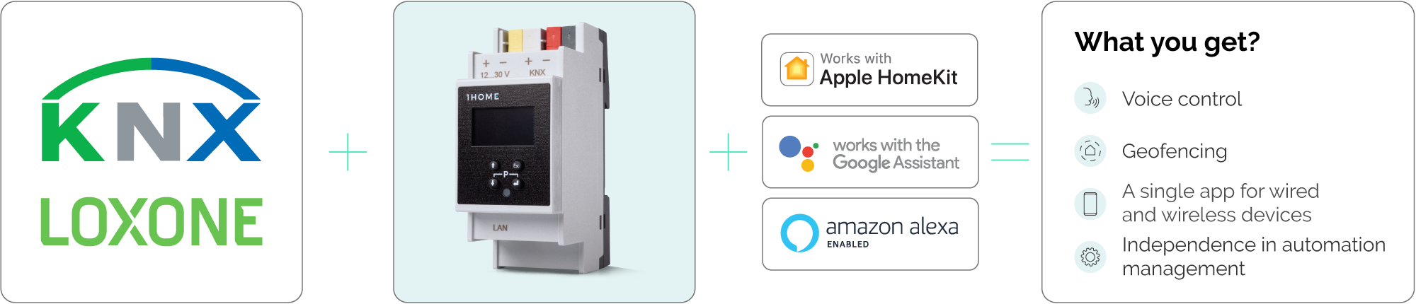 1Home Bridge connects Apple HomeKit, Amazon Alexa, Google Home or Sonos*** to your KNX or Loxone smart home.