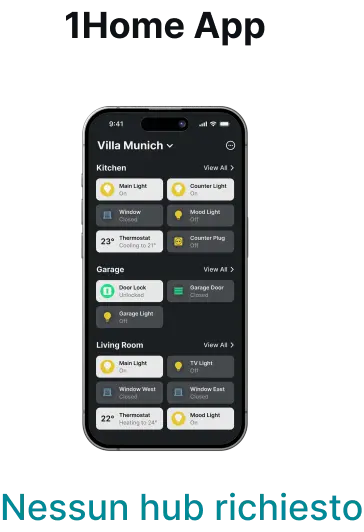 Rispetto ad altre app per smart home, l'app 1Home non richiede un hub aggiuntivo per funzionare, ad eccezione del controllo di dispositivi che utilizzano Thread.*