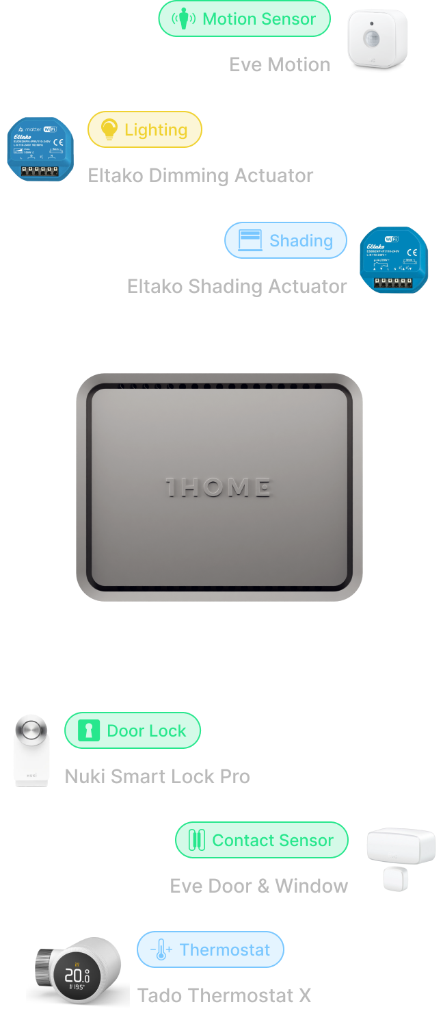 Use devices recommended by 1Home or choose between hundreds of Matter-certified devices.